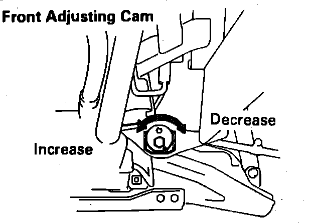 Caster and camber are adjusted by rotating front and/or rear adjusting cams as shown,