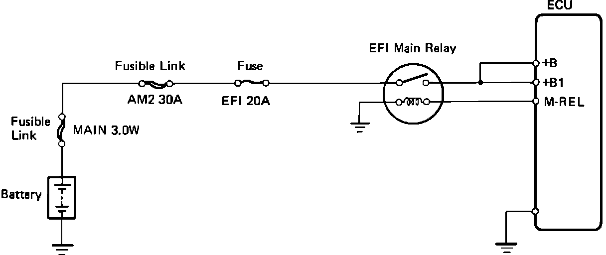 The EFI main relay is supplied battery current through the EFI fuse and is energized by a signal from the M-REL terminal of the ECU. The ECU receives relay input at terminals +B and +B1.