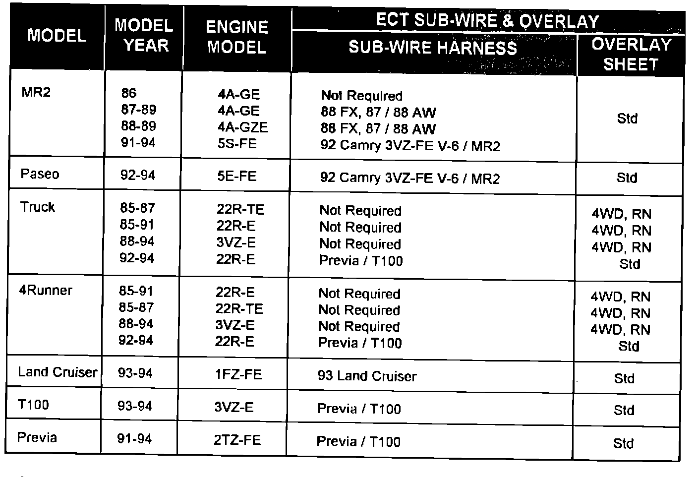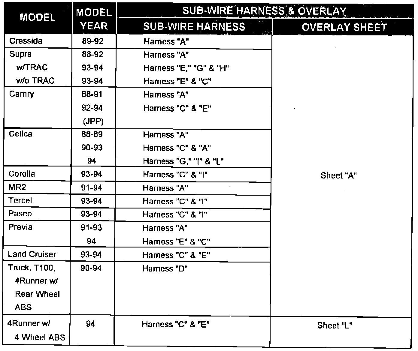ABS CHECKER SUB-WIRE HARNESS AND OVERLAY SHEET PART NUMBERS: