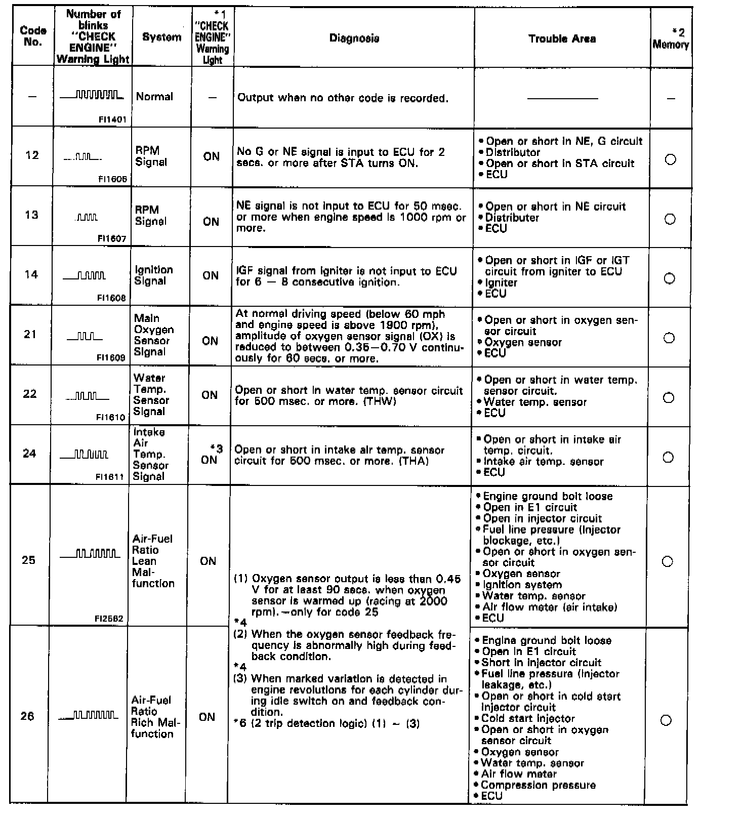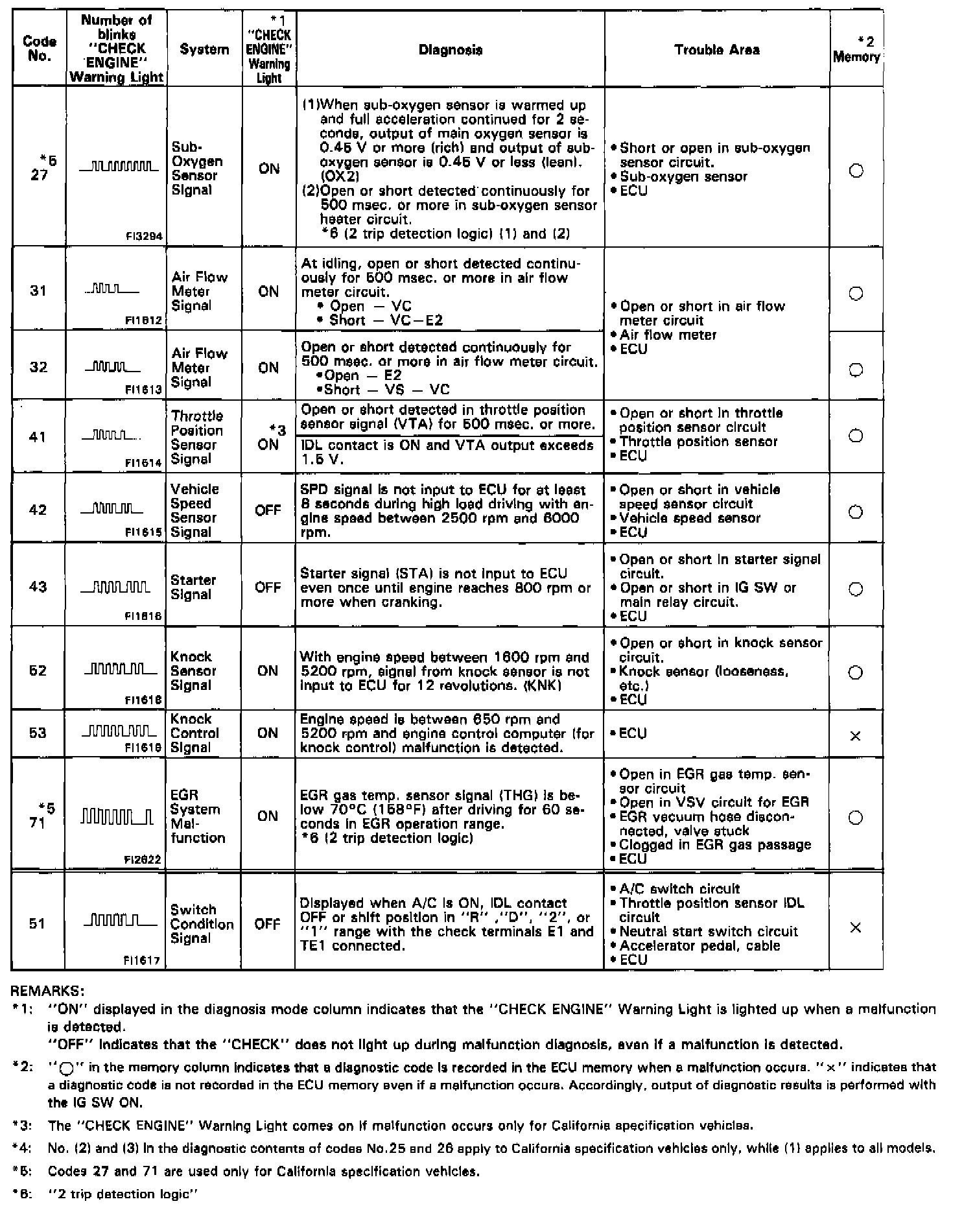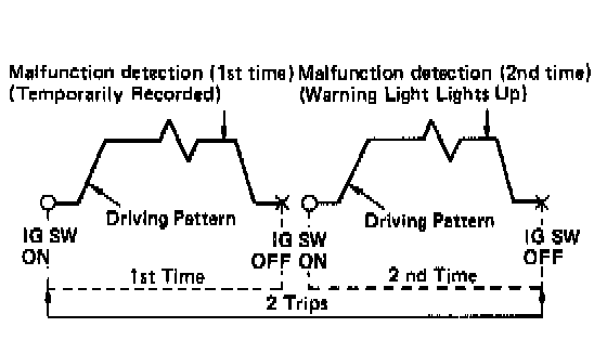 Diagnostic codes 25, 26, 27 and 71 use "2 trip detection logic". With this logic, when a malfunction is first detected, the malfunction is temporarily stored in the ECU memory. If the same case is detected again during the second drive test, this second detection causes the "CHECK ENGINE" Warning Light to light up.