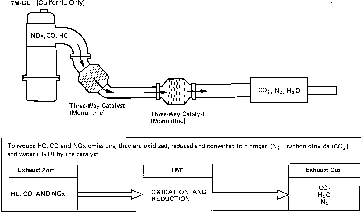 The three way catalyst (TWC) reduces oxides of nitrogen (NOx) as well as HC and CO, producing nitrogen, water, and carbon dioxide as by-products.