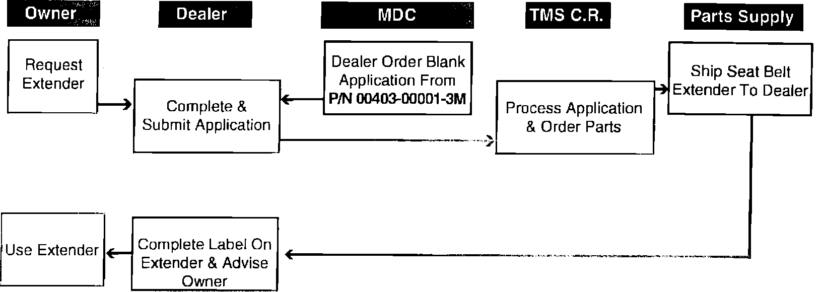 2. Dealer verifies need for extender and provides "application for seat belt extender" to owner. Dealer processes application form and sends it to TMS Customer Relations Department.