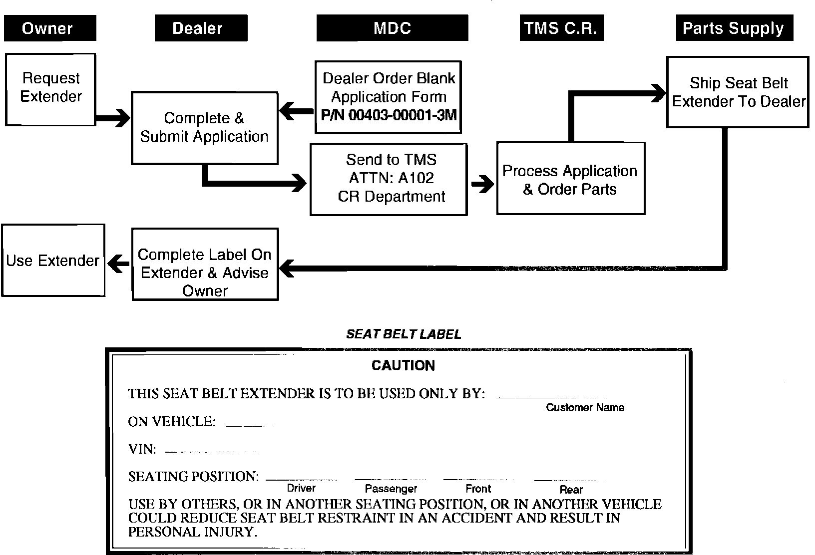 2. Dealer verifies need for extender and provides "application for seat belt extender" to owner. Dealer processes application form and sends it to TMS Customer Relations Department - A102.