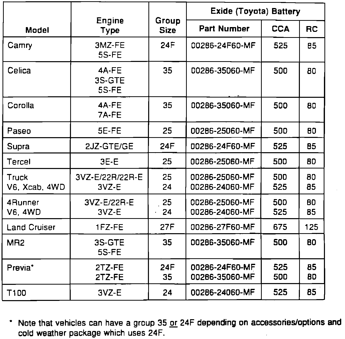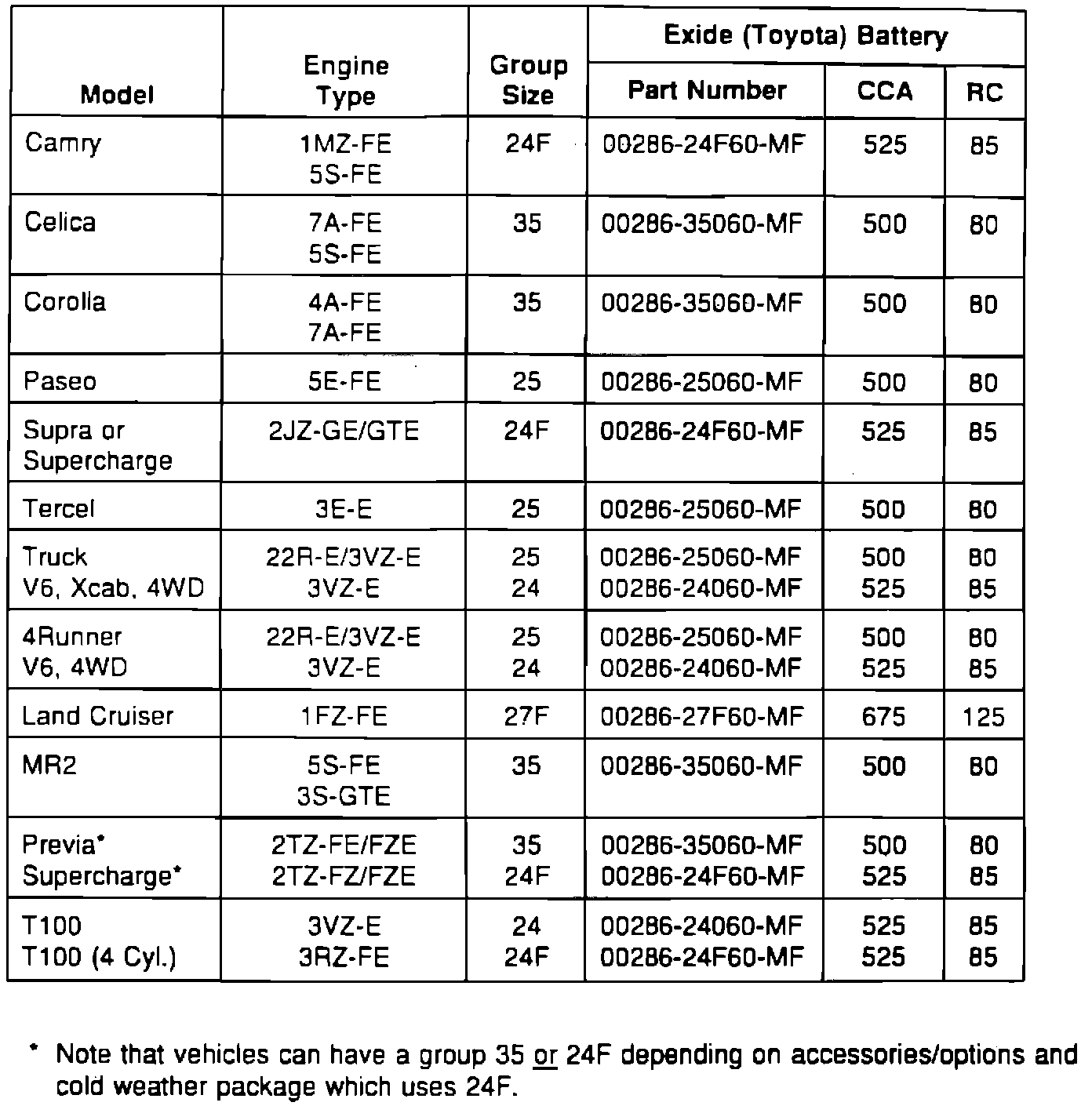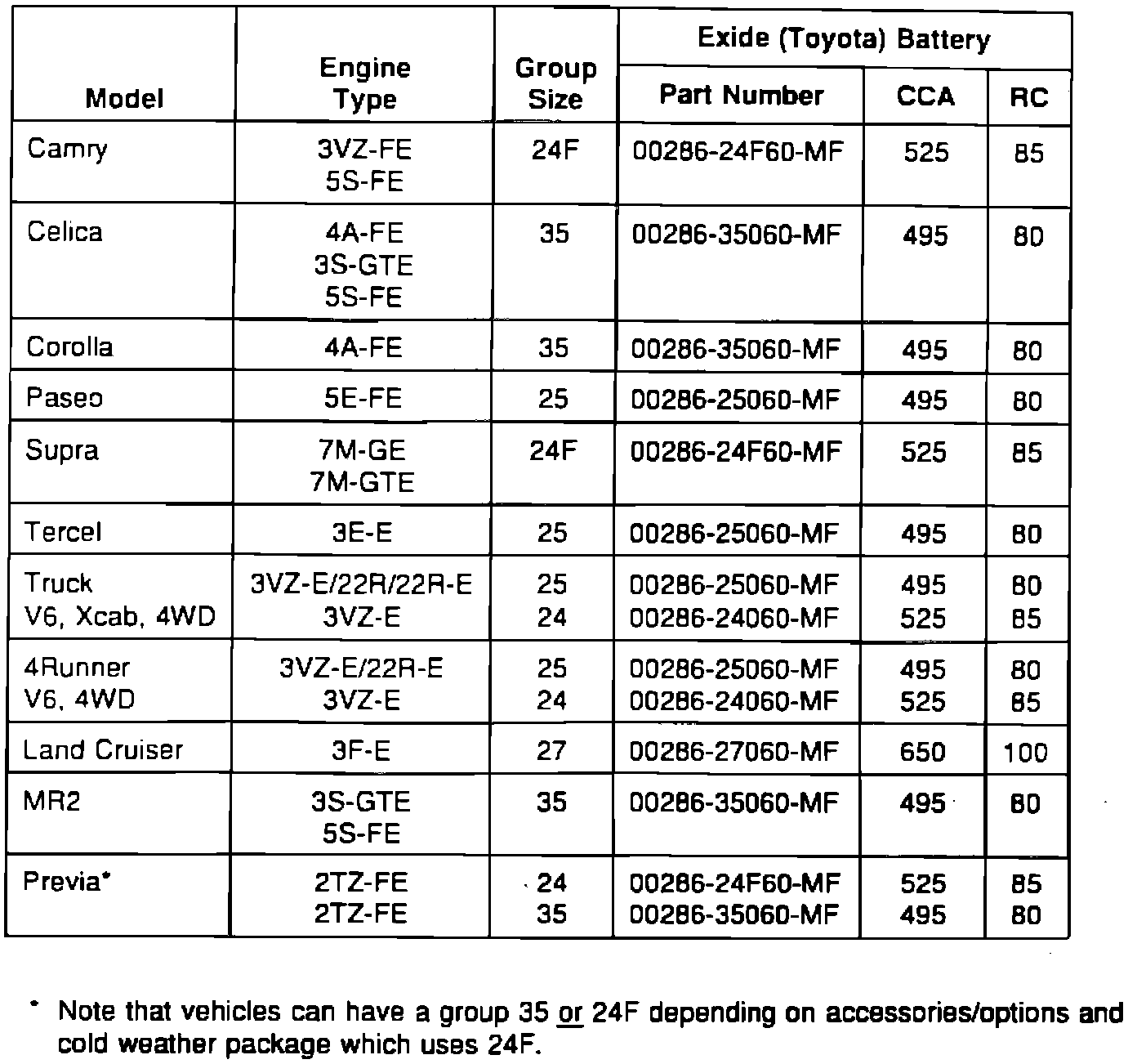 All batteries removed under the guidelines of the new vehicle warranty must be replaced with Toyota 60 month replacement batteries using the designated part numbers noted on the tables in this bulletin, based on model and model year. Use of a replacement battery other than those specifically designated will result in the denial of the corresponding warranty claim.