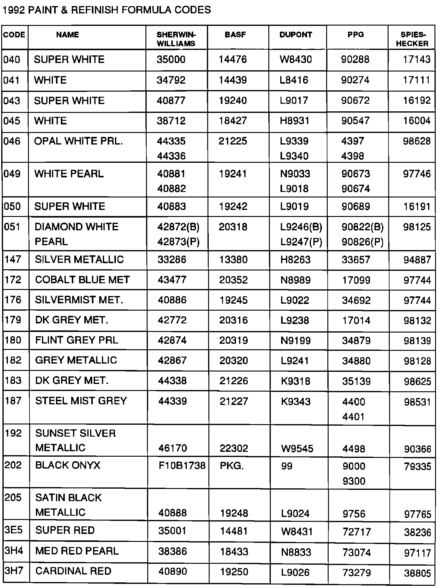 1992 PAINT & REFINISH FORMULA CODES