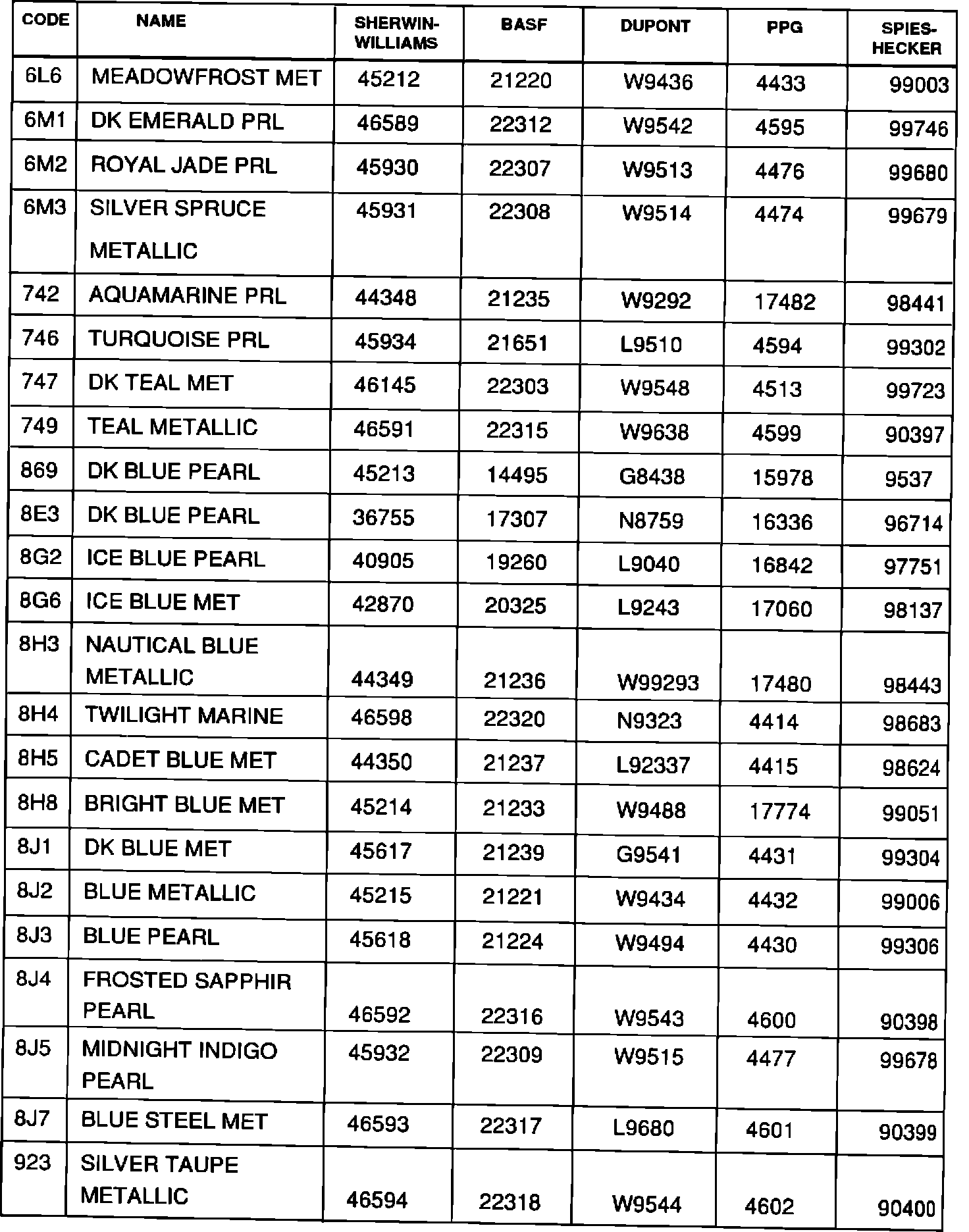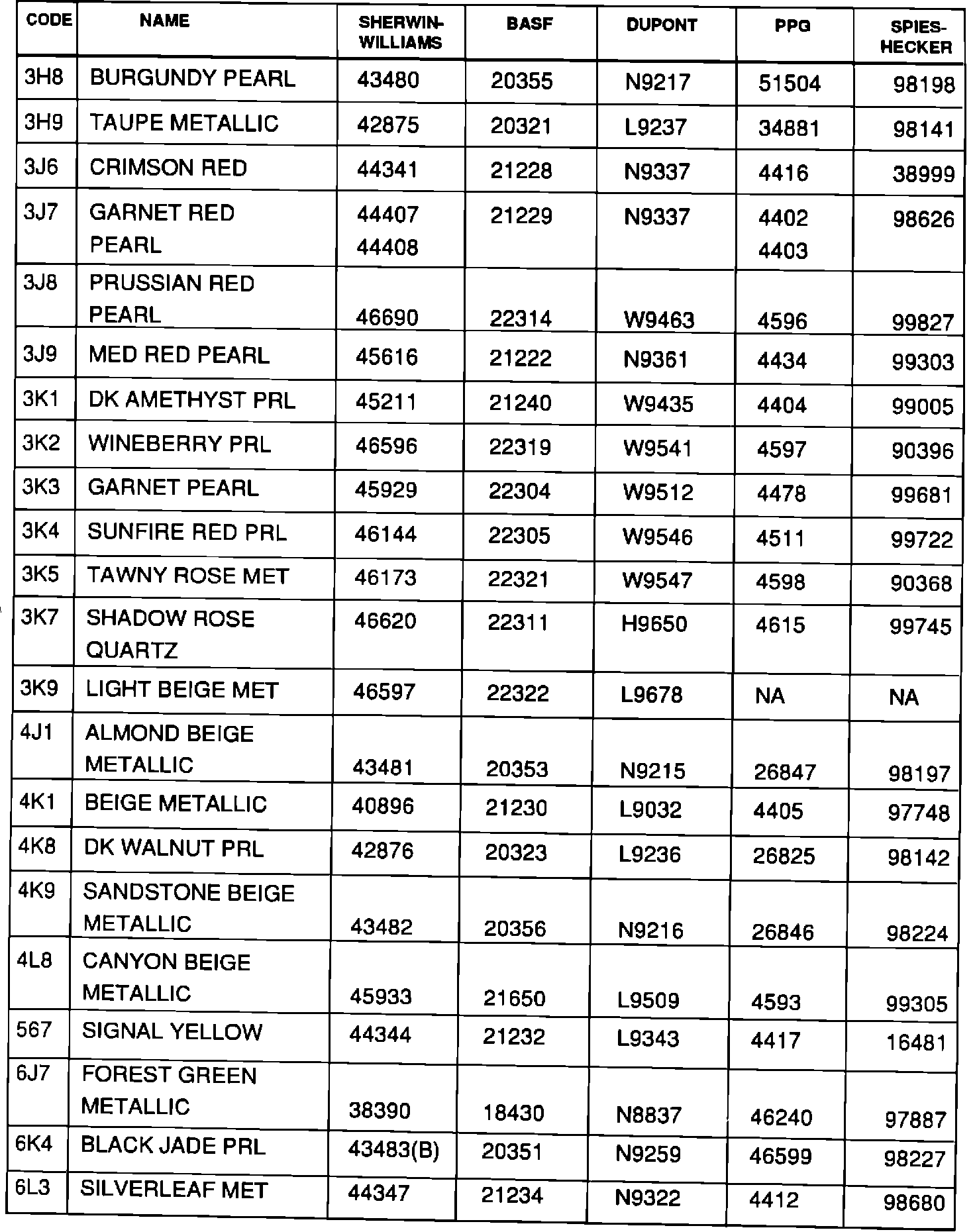 The following is a listing of 1992 Toyota paint codes and corresponding refinish formula codes for refinish paint companies -- Sherwin Williams, BASF, Du Pont, PPG, SpiesHecker, Sikkens and Herberts Standox.