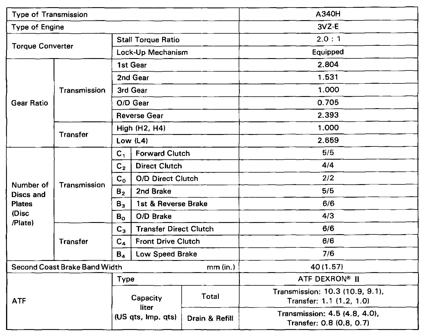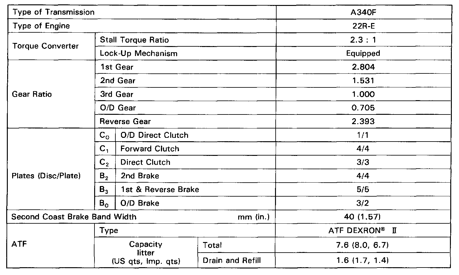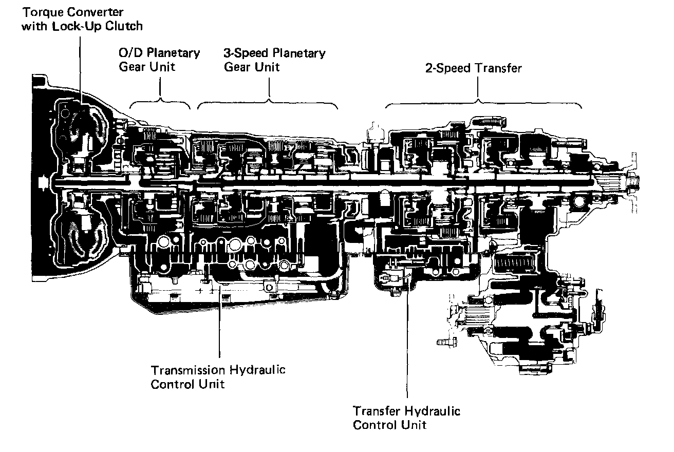 The A340F automatic transmission is a 4-speed automatic transmission with mechanically controlled 4WD transfer, developed with the aim of producing an easy-driving 4WD vehicle. The transmission section has fundamentally the same construction as the A340E automatic transmission.