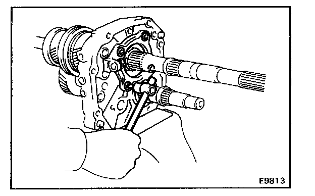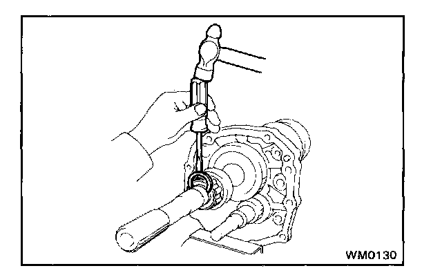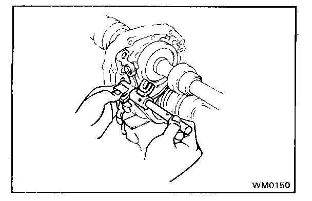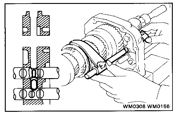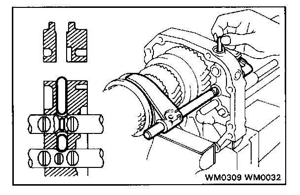 c. Align the each bearing outer race and each shift fork shaft end with the case holes.