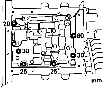1. Align manual valve lever with manual valve, then install attaching bolts as shown, Fig. 6, then tighten to specifications. Attaching bolt lengths (mm) are indicated in Fig. 6.