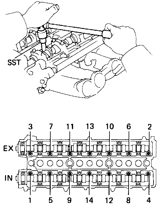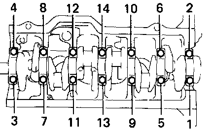 (a) Uniformly loosen and remove the main bearing cap bolts in several passes, in the sequence shown.