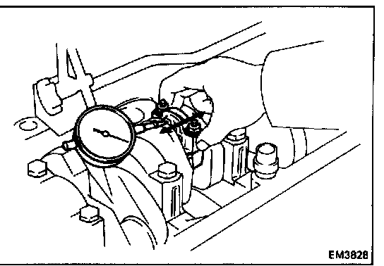 Using a dial gauge, measure the crankshaft thrust clearance while prying the crankshaft back and forth with a screwdriver.