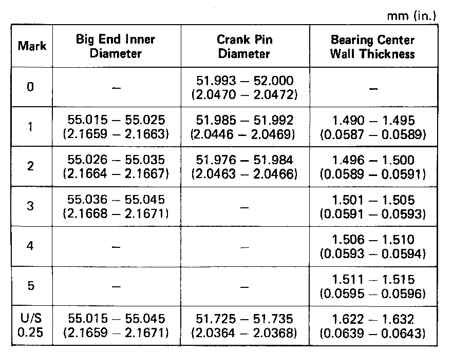HINT: If using a standard size bearing, replace with one having the same number. If the number of the bearing cannot be determined, select a bearing from the table below according to the numbers imprinted on the connecting rod cap and crankshaft. There are five sizes of standard bearings, marked "1", "2", "3,', "4" and "5" accordingly.