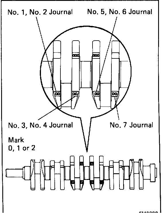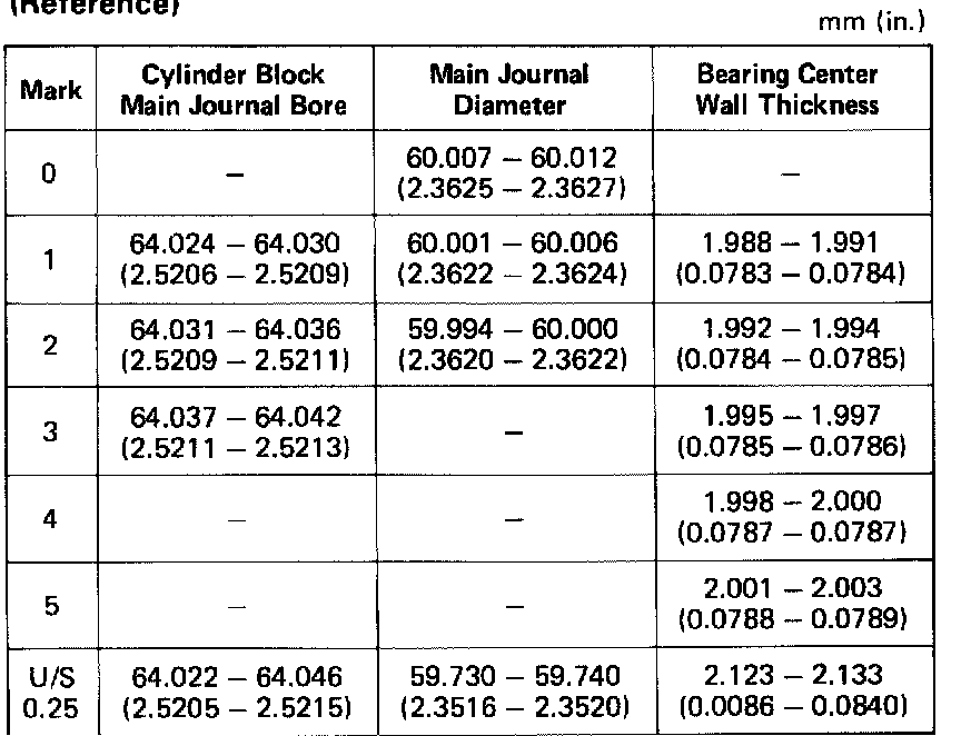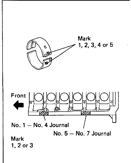 HINT: If using a standard size bearing, replace with one having the same number. If the number of the bearing cannot be determined, select a bearing from the table below according to the numbers imprinted on the cylinder block and crankshaft. There are five sizes of standard bearings, marked "1", "2", "3", "4" and "5" accordingly.