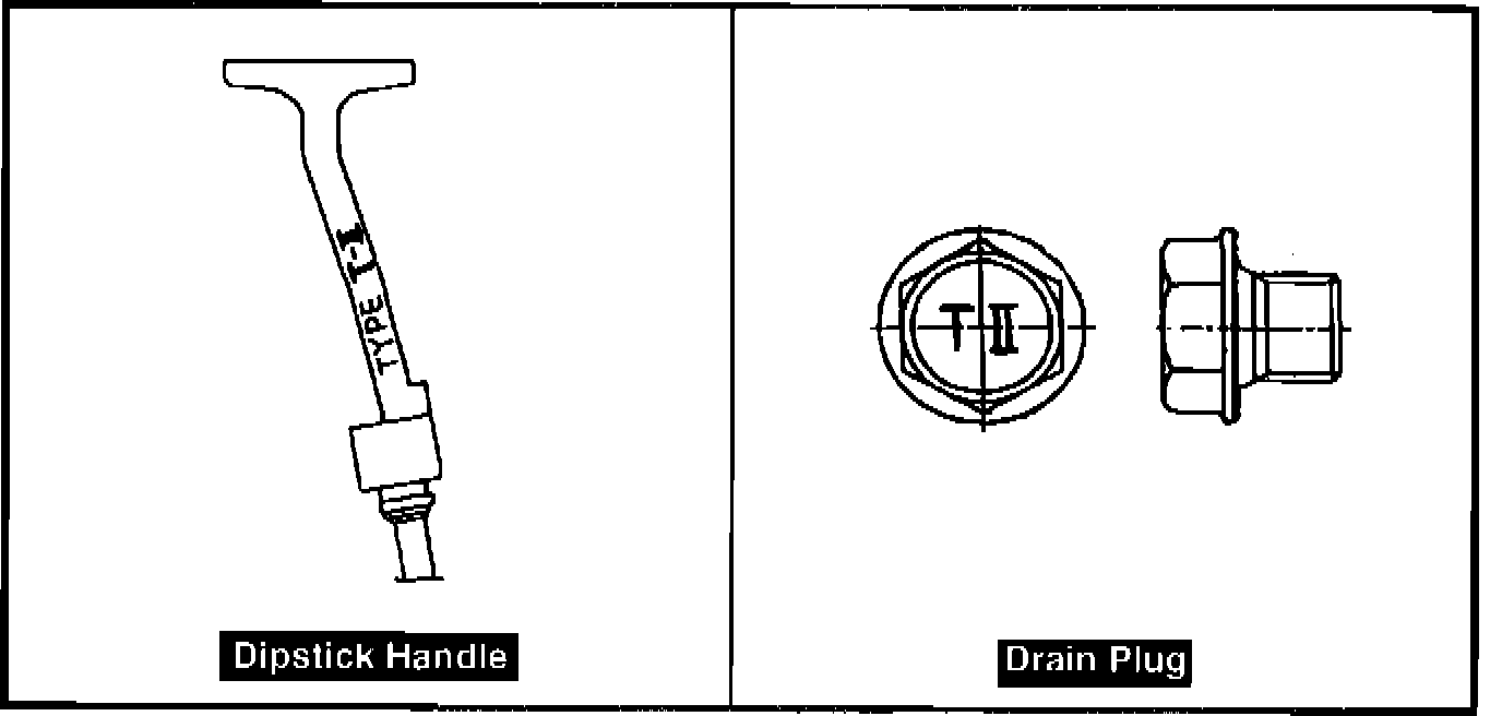 To identify vehicles that require the new Type T-II ATF, the handle of the automatic transmission dipstick and drain plug are marked as shown.