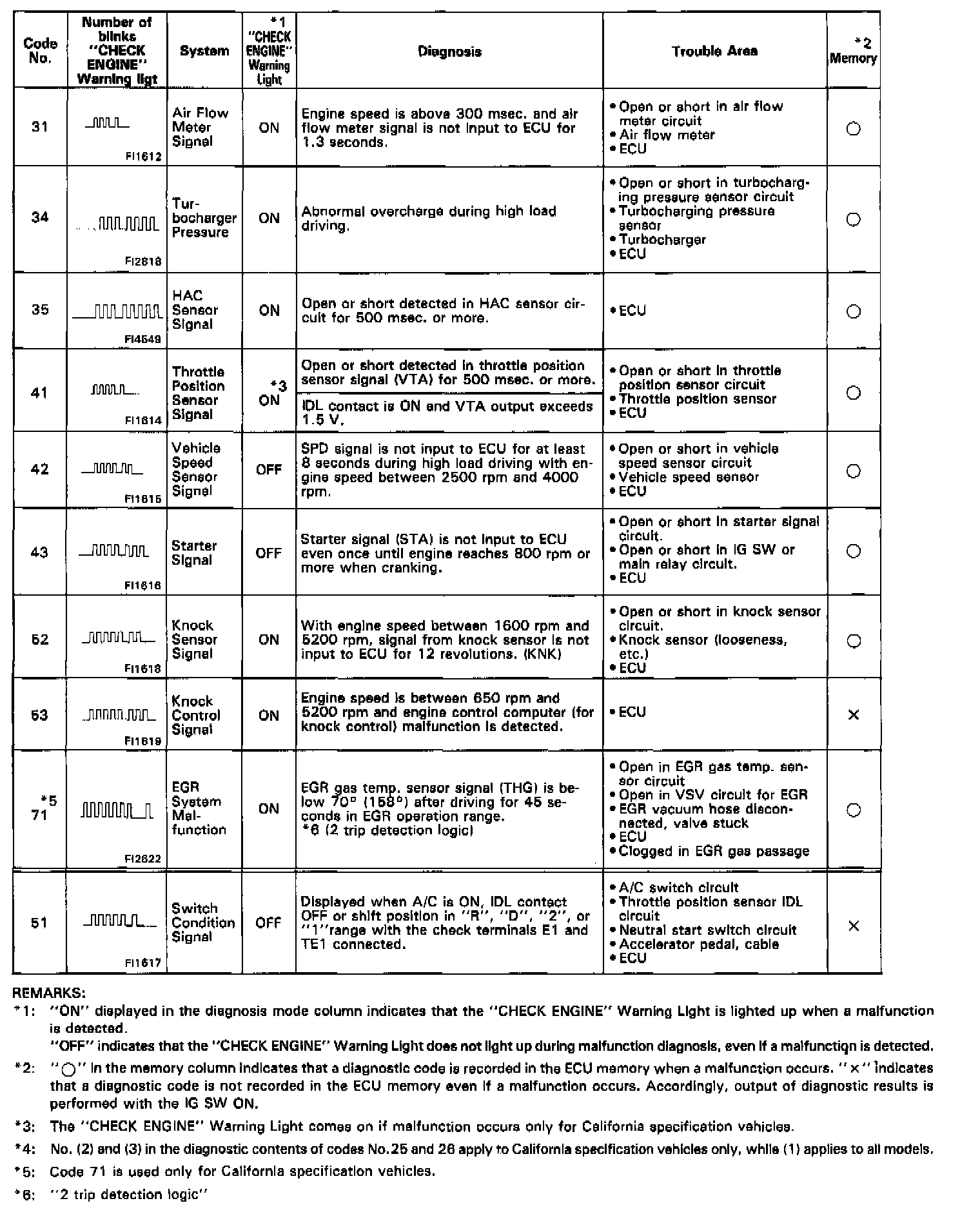 Diagnostic codes 25, 26, 27 and 71 use "2 trip detection logic". With this logic, when a malfunction is first detected, the malfunction is temporarily stored in the ECU memory. If the same case is detected again during the second drive test, this second detection causes the "CHECK ENGINE" Warning Light to light up.