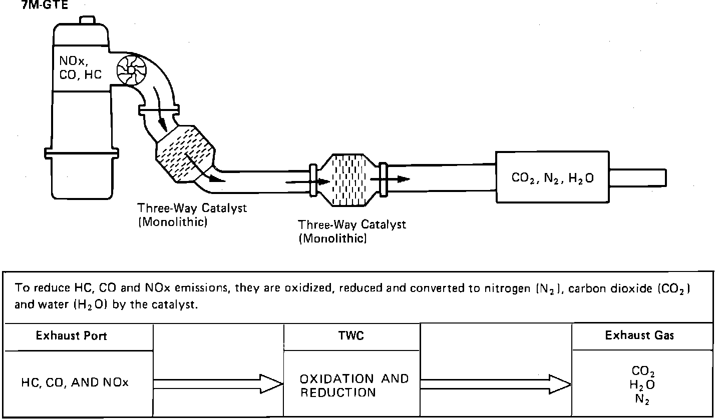 The three way catalyst (TWC) reduces oxides of nitrogen (NOx) as well as HC and CO, producing nitrogen, water, and carbon dioxide as by-products.