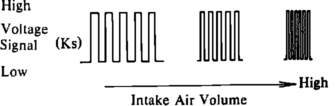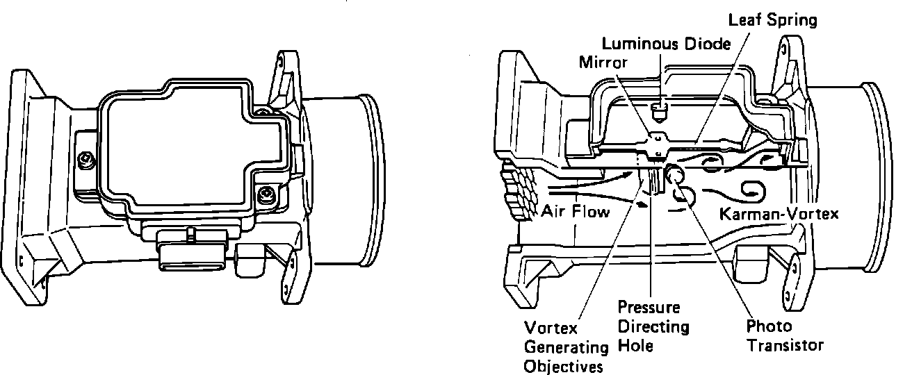 The Optical Karman-Vortex Air Flow Meter, located in the right front portion of the engine compartment, precisely measure air flow into the engine and relays this information to the ECU. The air flow meter is fitted with a vortex generator (basically, an obstruction in the air stream). As air flows past the vortex generator, vortices (turbulent air flow) are generated in direct proportion to the air flow.