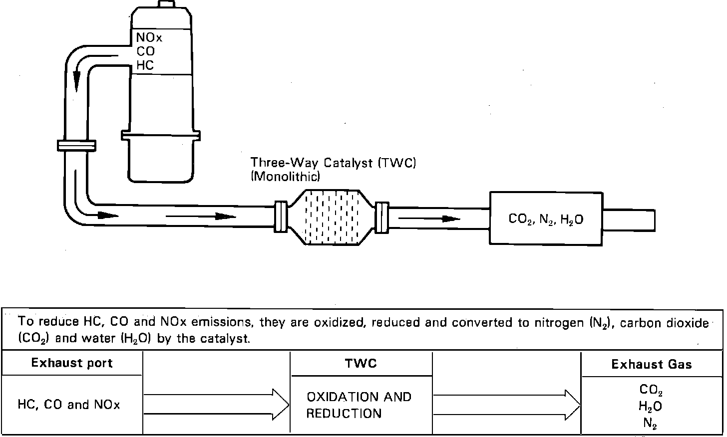 The three way catalyst (TWC) reduces oxides of nitrogen (NOx) as well as HC and CO, producing nitrogen, water, and carbon dioxide as by-products.