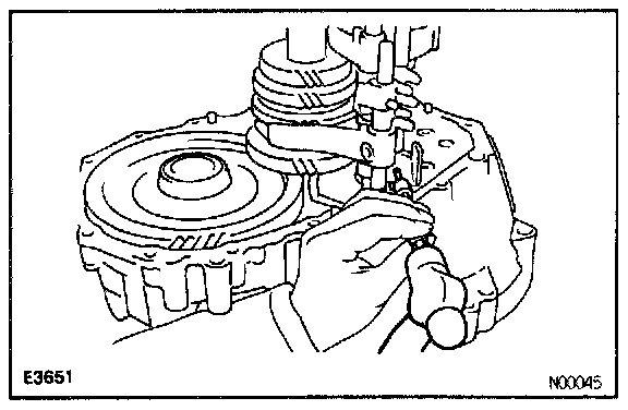 Using a pin punch and a hammer, drive out the slotted spring pin from the reverse shift fork.