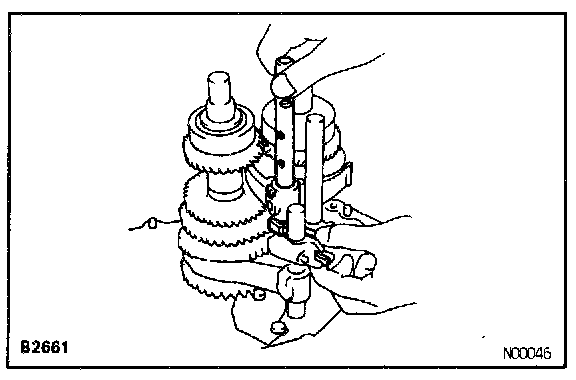 d. Using SST, remove the 5th gear, No.3 hub, synchronizer ring, needle roller bearings and spacer.