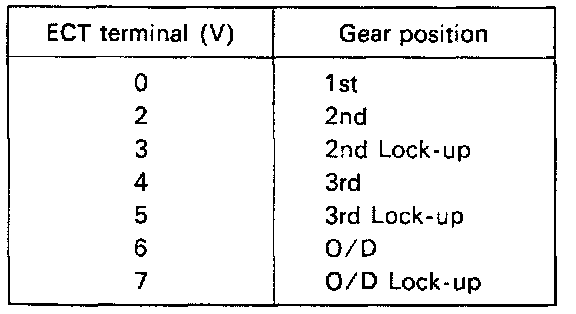 HINT: Determine the gear position by a light shock or change in engine rpm when shifting. The lock-up clutch will turn ON only infrequently during normal 2nd and 3rd gear operation. To trigger this action, press the accelerator pedal to 50% or more of its stroke. At less than 50%, the voltage may change in the sequence 2V - 4V - 6V - 7V.