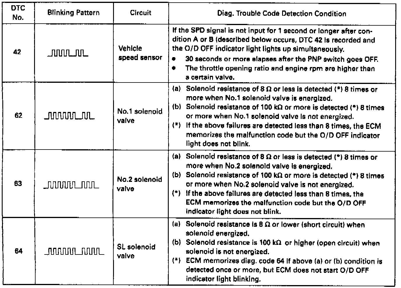 ^ Codes 42, 62, 63 and 64 are limited to short or open circuits in the electrical system which consists of the solenoids, wire harnesses, and connectors. The engine control module (ECM) is unable to detect mechanical trouble (sticking valve, for example) in the shift solenoid valves.