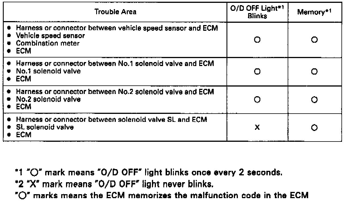 ^ If the diagnosis system outputs a diagnostic trouble code even though the "O/D OFF" indicator was not blinking, there is intermittent trouble. Check all the connections in the circuits corresponding to that code.