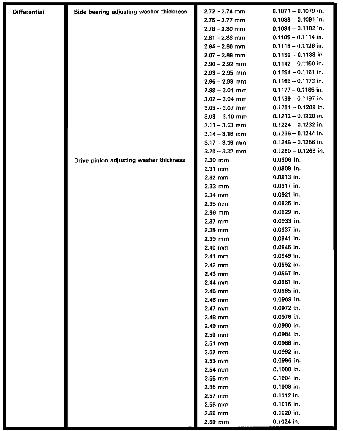 Rear Differential, Side Bearing/Pinion Thickness: