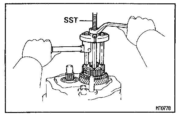 b. Using SST, remove the No.3 clutch hub with synchronizer ring.