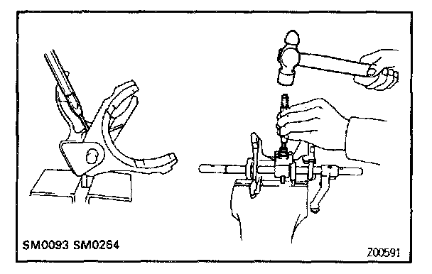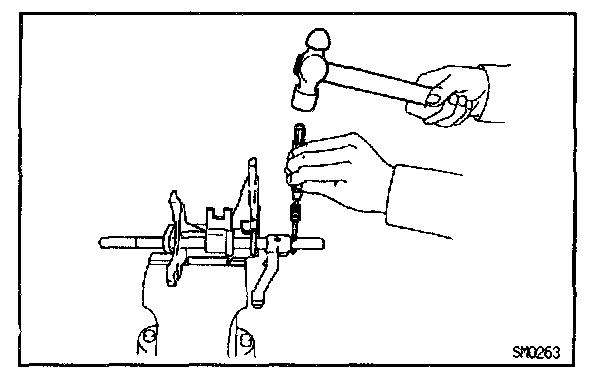c. Using a pin punch and hammer, drive out the slotted spring pin from the No.1 fork shaft as shown in the figure.