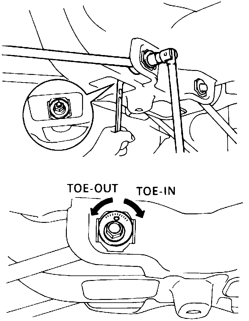 1. Measure distance between wheel disc and corner of cam bracket, Fig. 7. Distance should be identical for both wheels.Fig. 7 Rear Toe-in Measurement.: