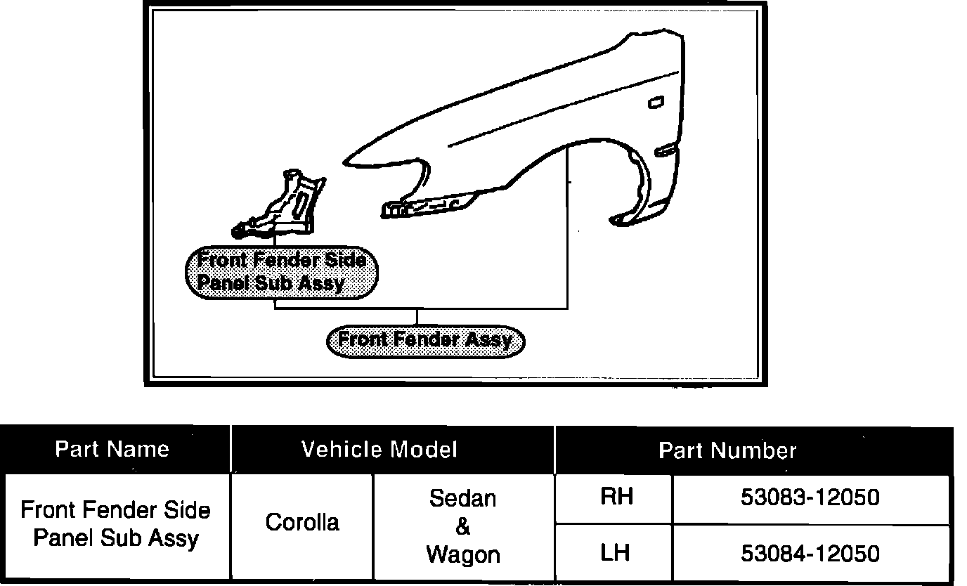In order to improve serviceability on '93 Corolla models, the side panel sub-assy of the front fender, as illustrated, can now be ordered as a separate supply part.
