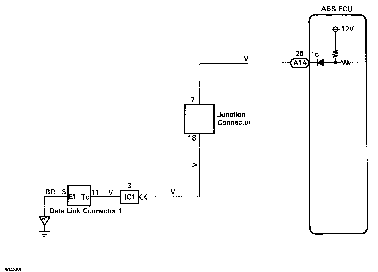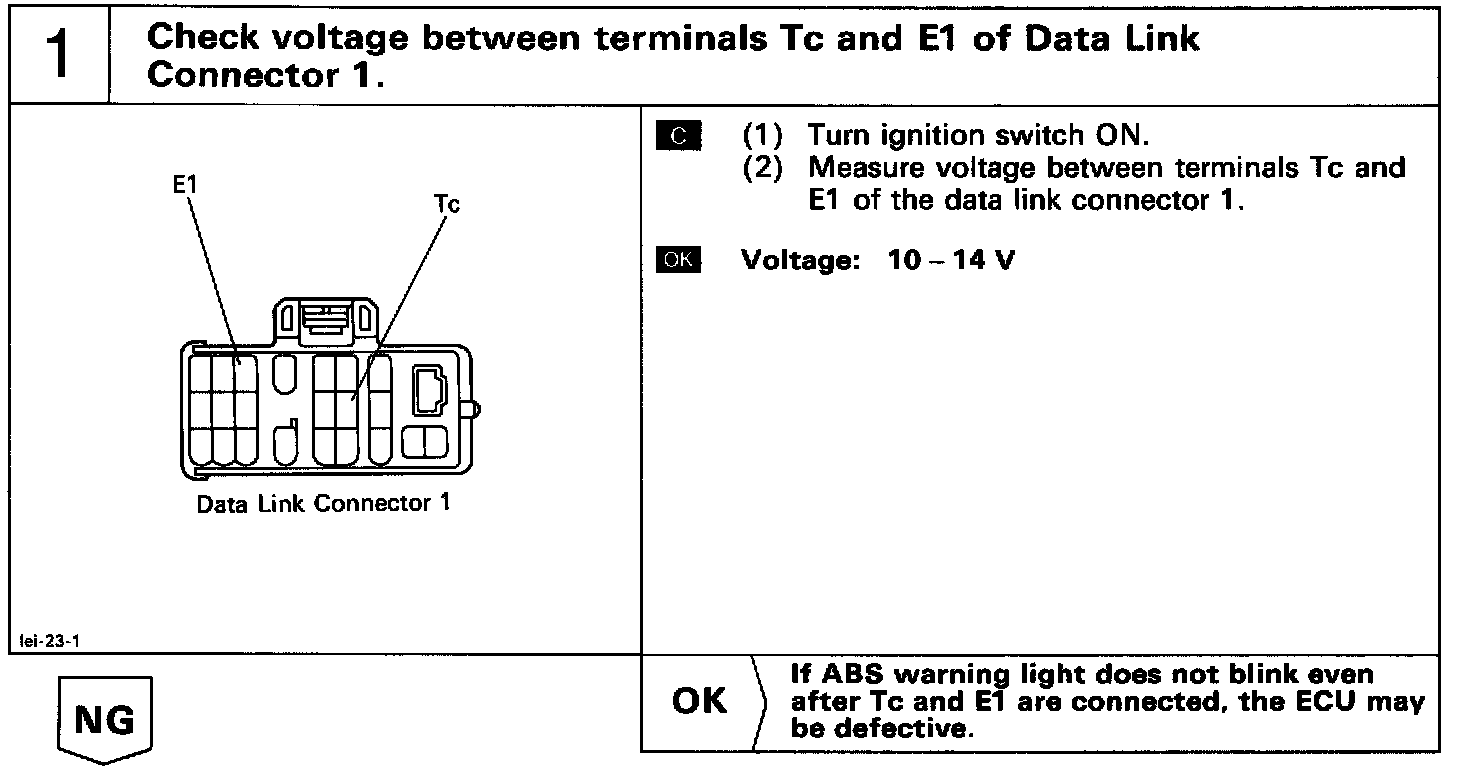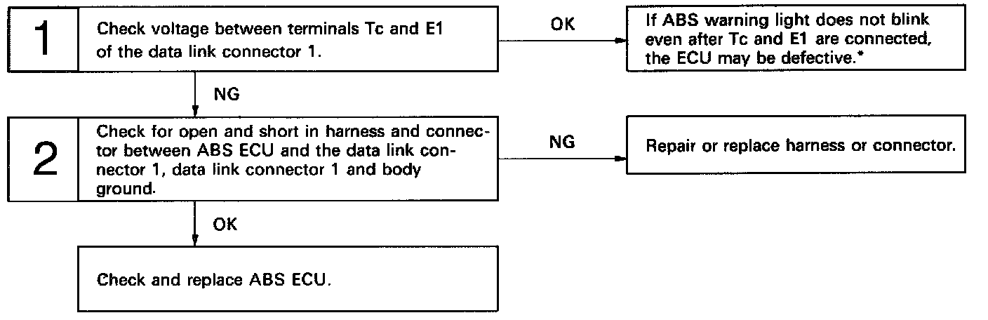 Connecting between terminals Tc and E1 of the data link connector 1 causes the ECU to display the diagnostic trouble code by flashing the ABS warning light.