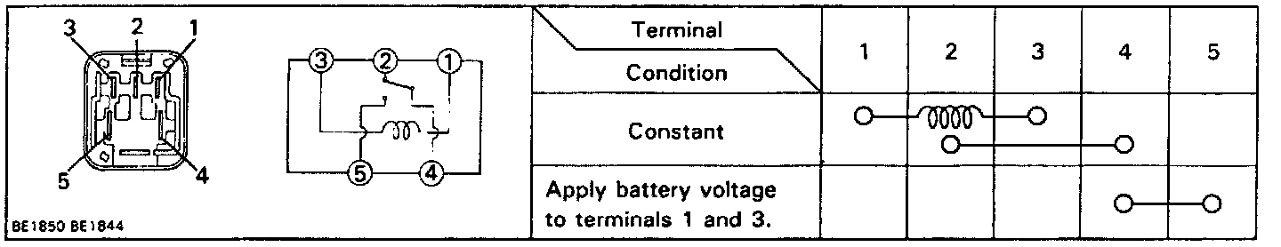 Apply power to terminals 1 and 3. Continuity should exist between terminals 4 and 5. If not as specified, replace the relay.