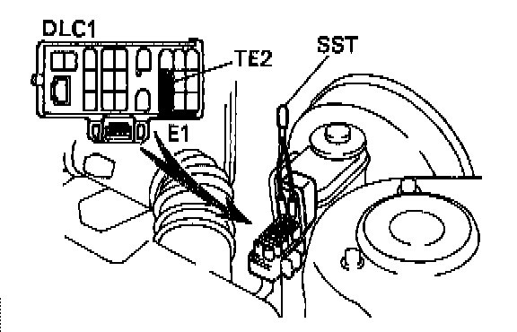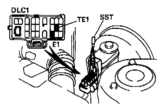 7. After the road test, using SST, connect terminals TE1 and E1 of data link connector 1. SST 09843-18020