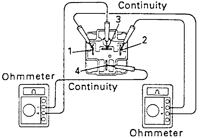 b. Apply battery voltage across terminals 1 and 2, then confirm that continuity is not present between terminals 3 and 4. If continuity is found, replace relay.
