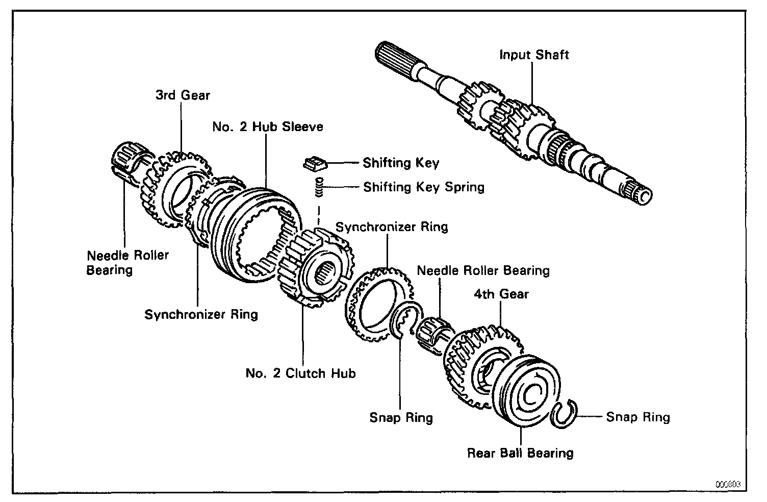4. REMOVE REAR BALL BEARING, FOURTH GEAR, NEEDLE ROLLER BEARING, SPACER AND SYNCHRONIZER RING FROM INPUT SHAFT