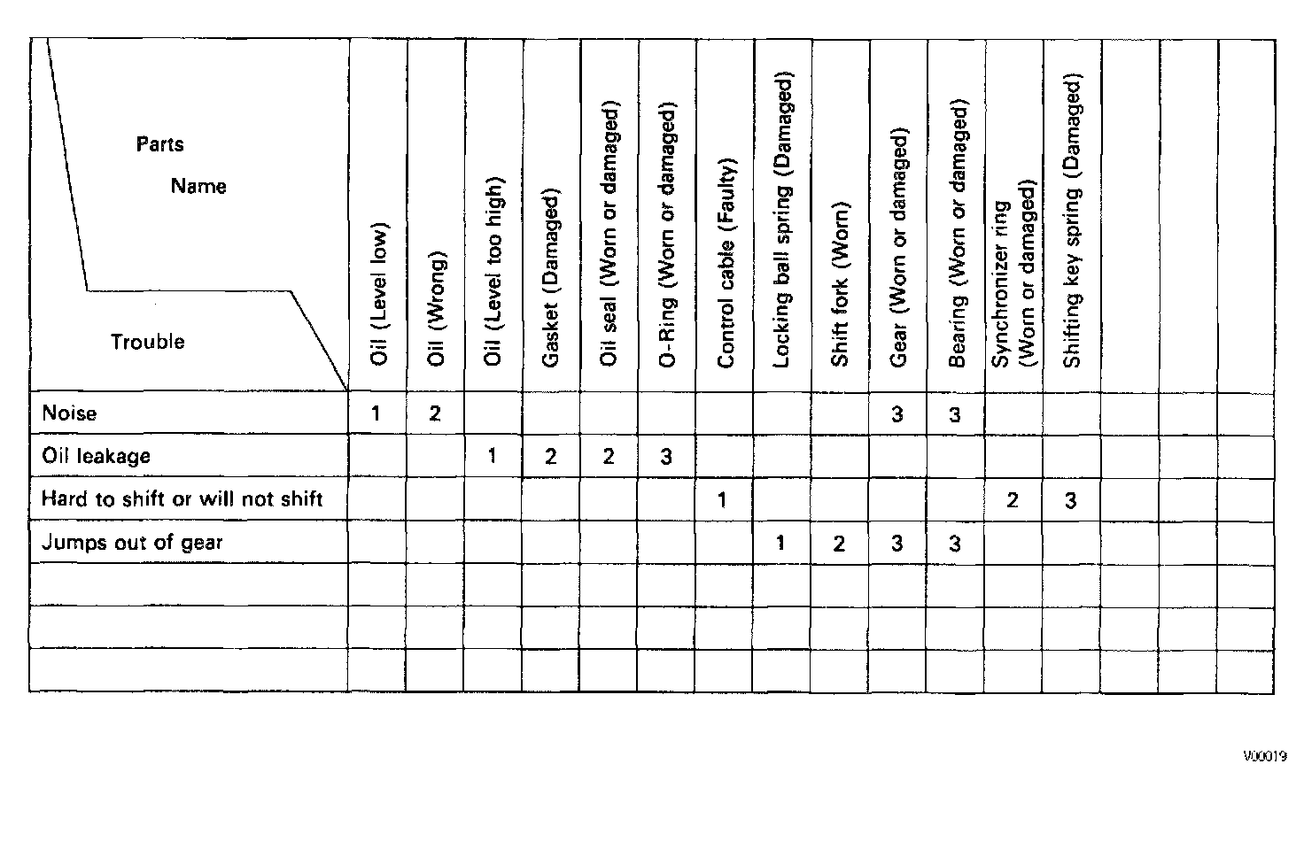 You will find the troubles easier using the table well shown. In this table, each number shows the priority of causes in troubles. Check each part in order. If necessary, replace these parts.