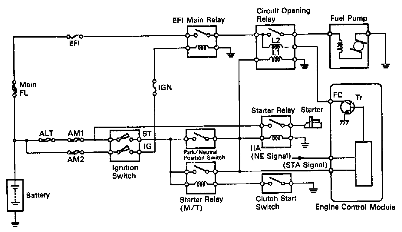 When the STA signal and NE signal are input to the ECM, Tr is turned ON, current flows to coil L2 of the circuit opening relay, the relay switches on and the fuel pump operates.