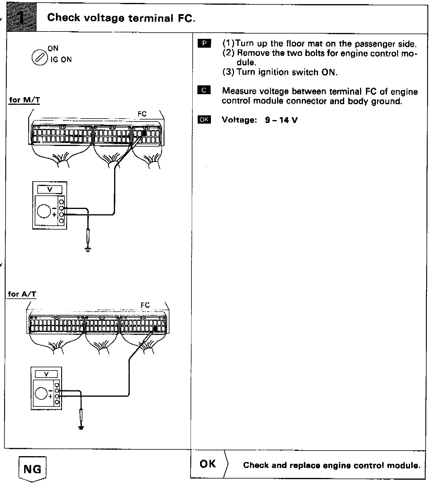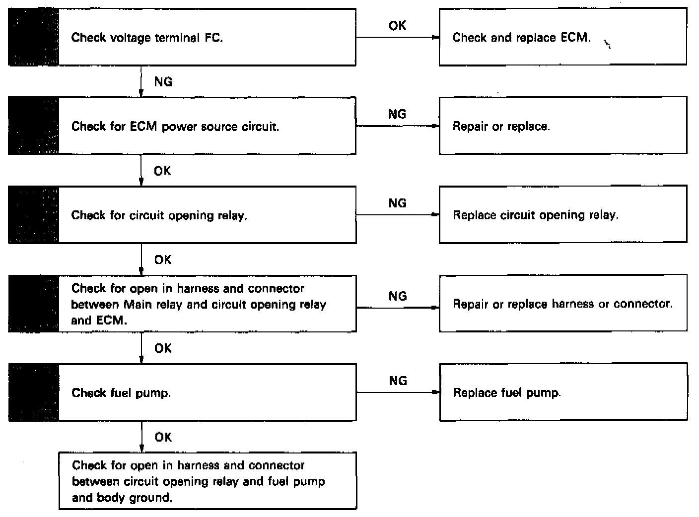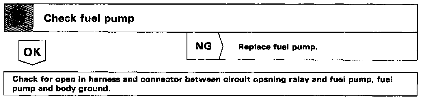 The fuel pump is switched on (low voltage at terminal FC) when STA is on or while the NE signal is input to the ECM.