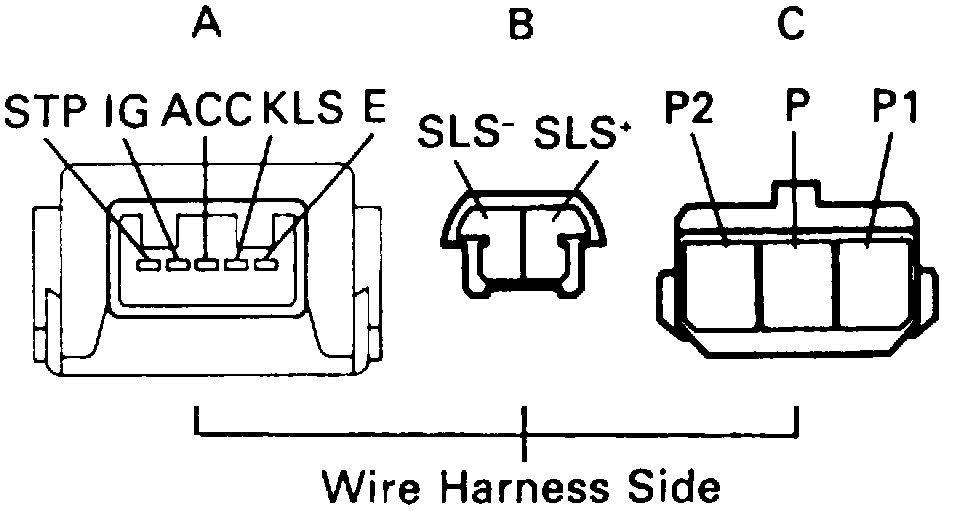 Using a suitable voltmeter, measure voltage at each ECU connector terminal, Figs. 9 through 12.. Refer to Figs. 13 through 17 for measuring conditions and voltage specifications.