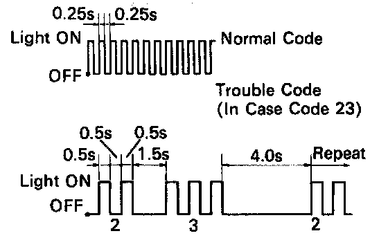 By turning on the ignition switch. disconnecting the service connector and use SST to connect Tc and E1 of the data link connector 1, the trouble can be identified by the number of blinks (diagnostic trouble code) of the warning light.