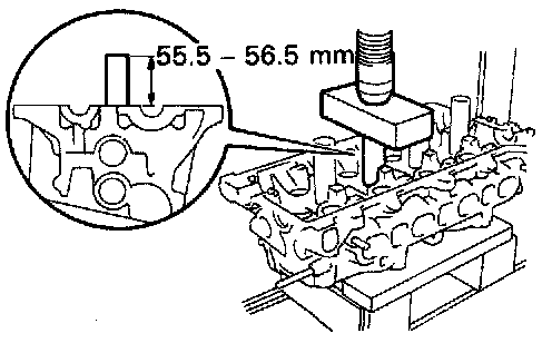 b. Using a press, press in a new spark plug tube until there is 55.5 - 56.6 mm (2.185 - 2.224 in.) protruding from the cylinder head.