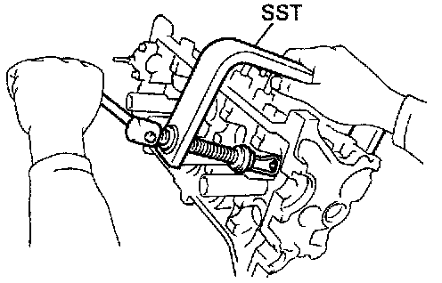 c. Using SST, compress the valve spring and place the two keepers around the valve stem. SST 09202-70010