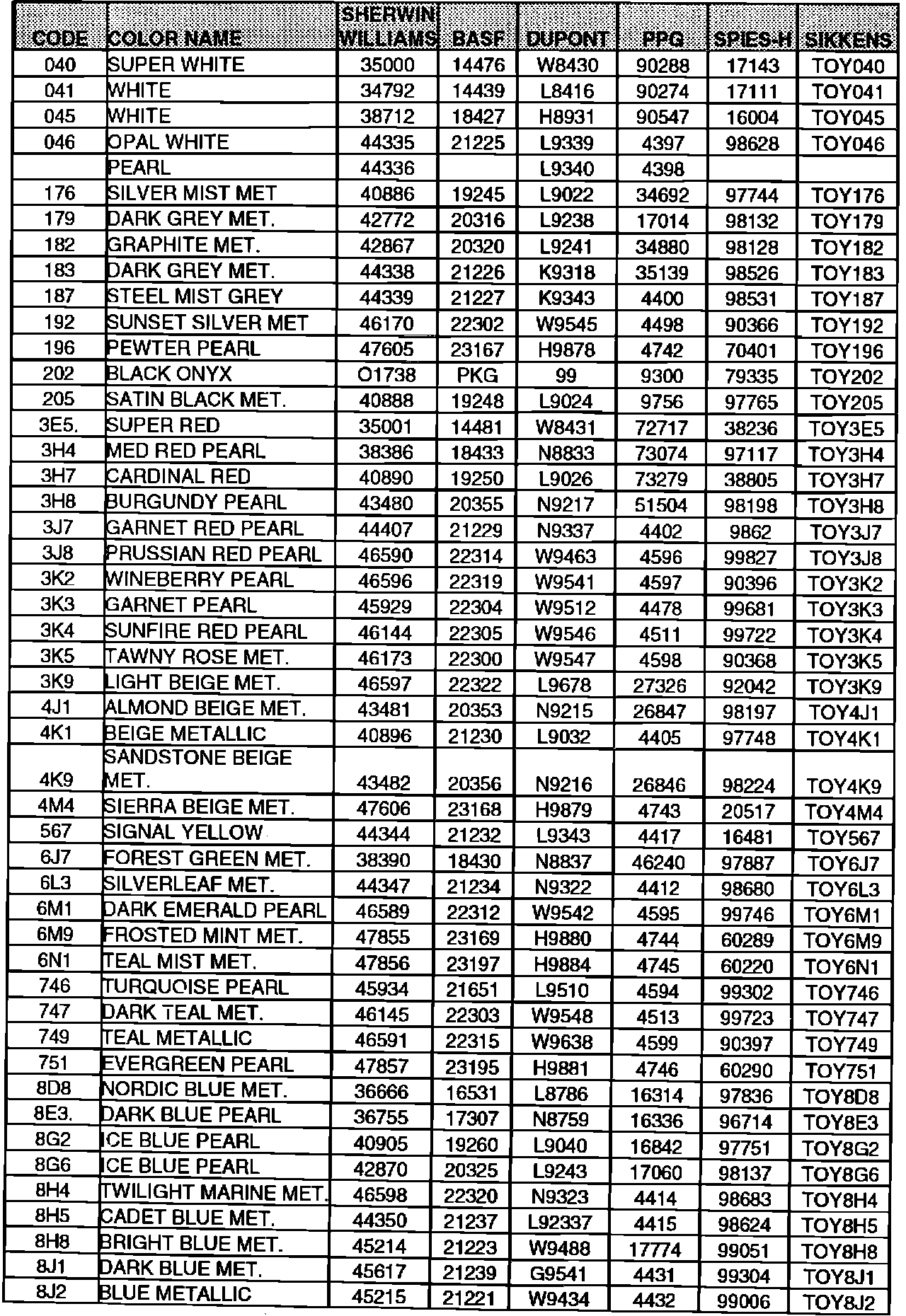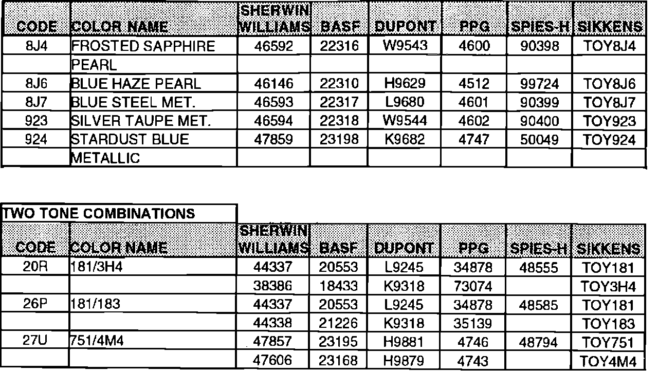 The following is a listing of 1993 Toyota paint codes and corresponding refinish formula codes from refinish paint companies -- Sherwin Williams, BASF, Du Pont, PPG, SpiesHecker, Sikkens and Herberts Standox.