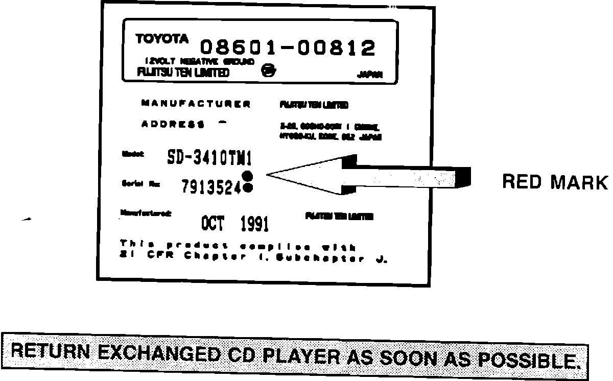 Exchange CD players which have been countermeasured can be identified by a RED MARK next to the Serial Number on the bottom of the CD player. Fujitsu Ten started shipping countermeasured exchange CD players starting 6/92.