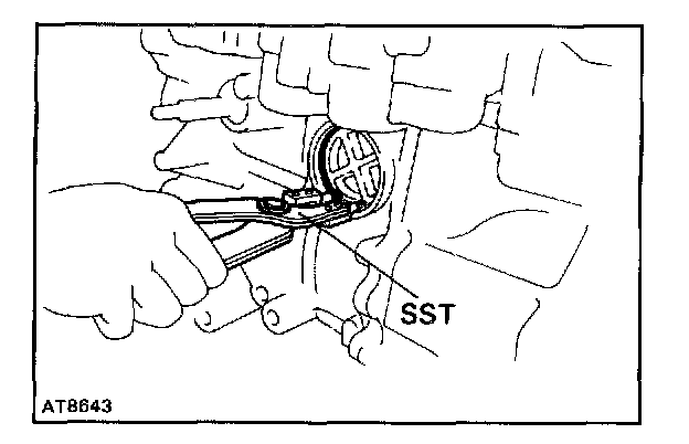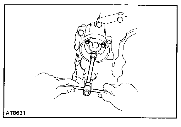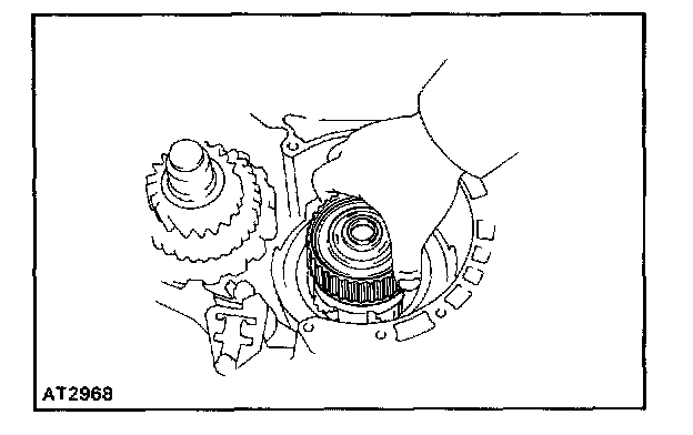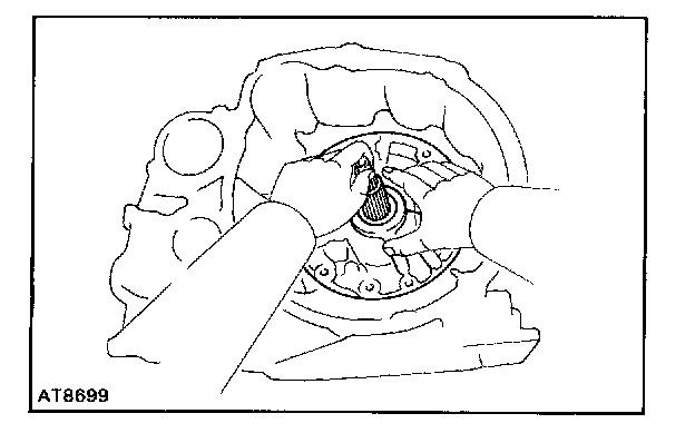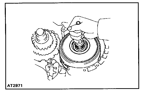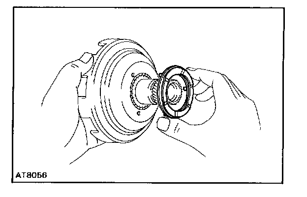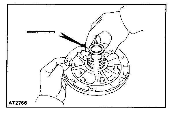 d. Hold the input shaft, and lightly press the oil pump body to slide the oil seal rings on the stator shaft through the direct clutch drum.