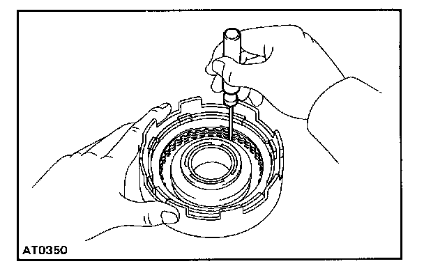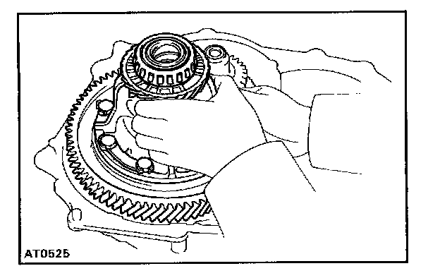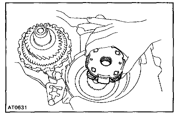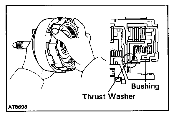 HINT: If the flukes of the discs are meshed with the hub correctly, the end of the bushing with the direct clutch drum will be flush with the surfaces of the forward clutch.