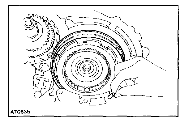 f. While rotating the forward clutch to mesh the front planetary ring gear and discs, install them.