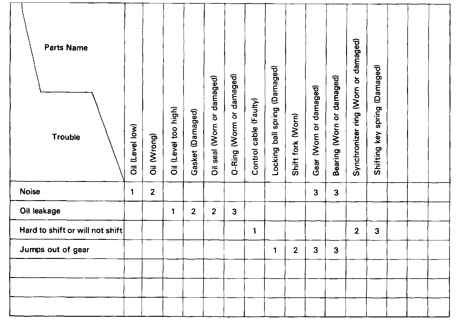 You will find the troubles easier using the image shown. In this image, each number shows the priority of causes in troubles. Check each part in order. If necessary, replace these parts.